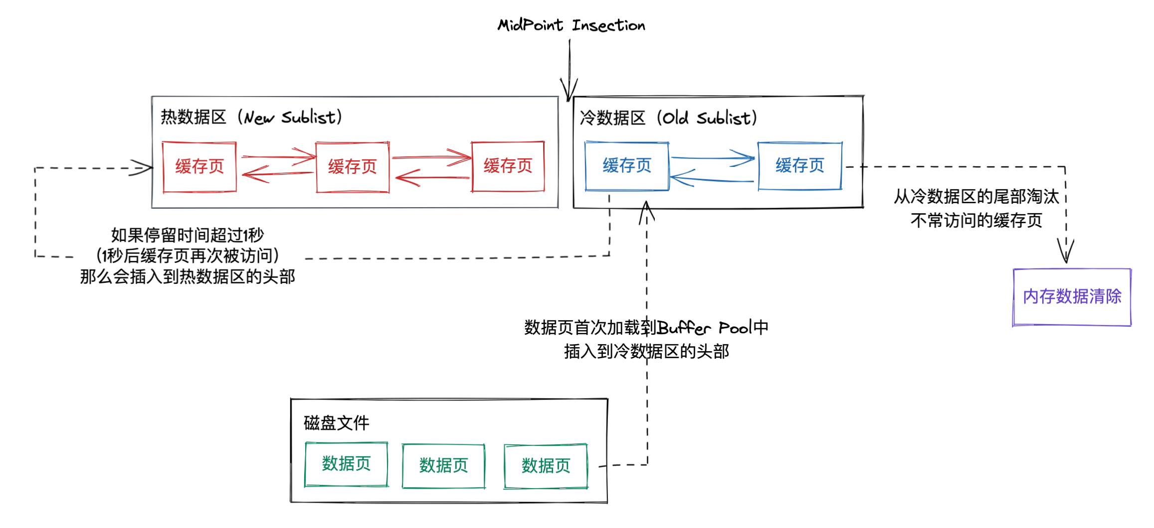 InnoDB 使用的是一种 LRU 的变体算法将缓冲池作为一个链表进行管理,当需要对 Buffer Pool 进行内存淘汰时,最近最少使用的缓存页将会被清除。使用 midpoint 把数据划分为冷数据区和热数据区。New Sublist:热数据区;Old Sublist:冷数据区。