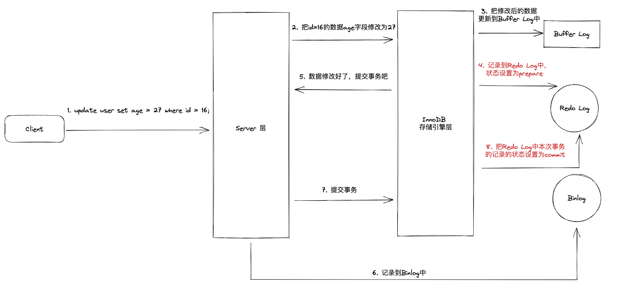 - commit 阶段:写入 Binlog 并把 Redo Log 的状态设置为 commit