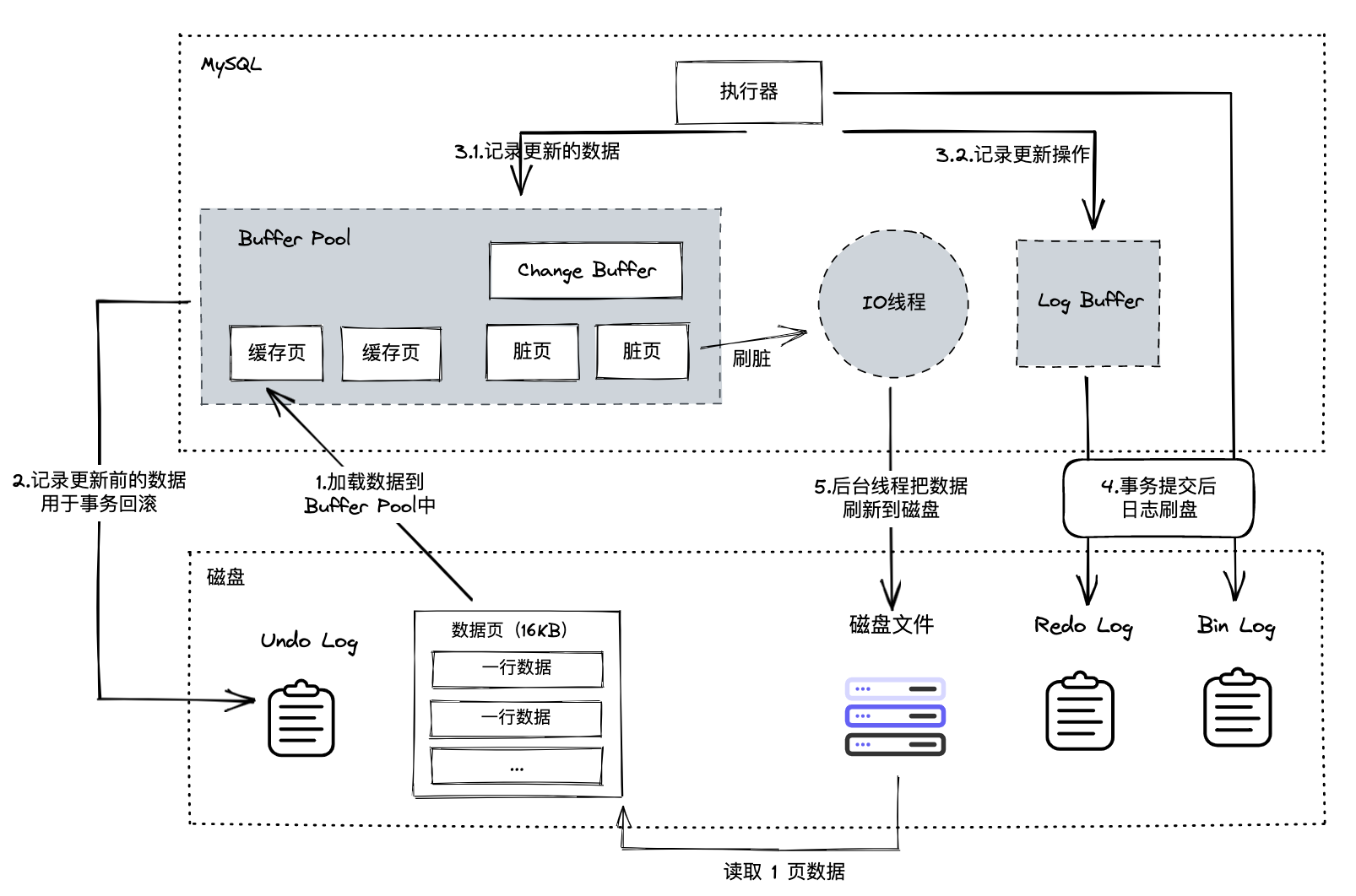 读取数据:如果数据存在 Buffer Pool,则直接从 Buffer Pool 中读取;如果不存在,则从磁盘读取数据,再写入到 Buffer Pool 中。