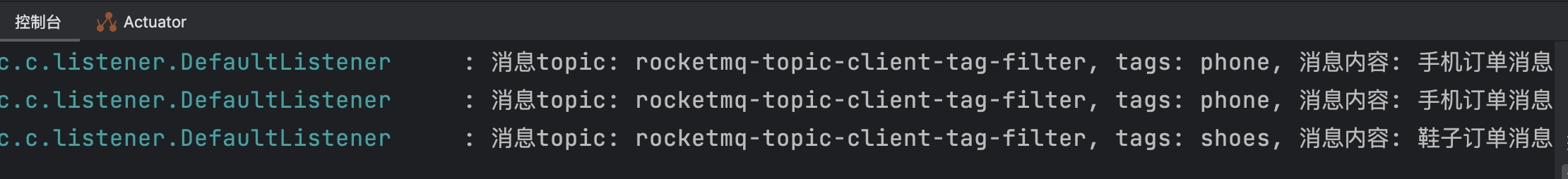 }- 消费结果,最终只有 tag 为 phone 和 clothes 的消息能被消费者消费