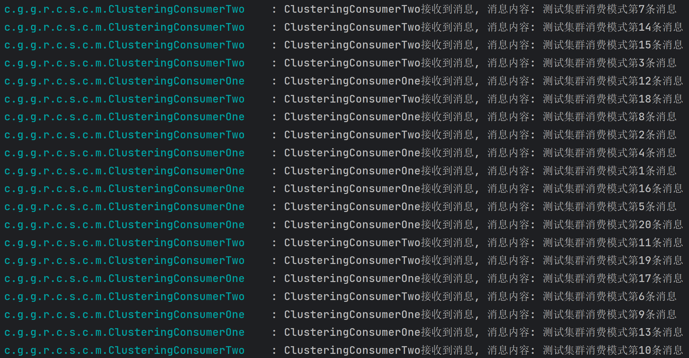 log.info("ClusteringConsumerTwo 接收到消息,消息内容:{}", message);