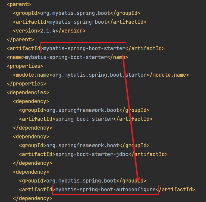 以 MyBatis 为例,mybatis-spring-boot-autoconfigure 依赖就在 mybatis-spring-boot-starter 里面