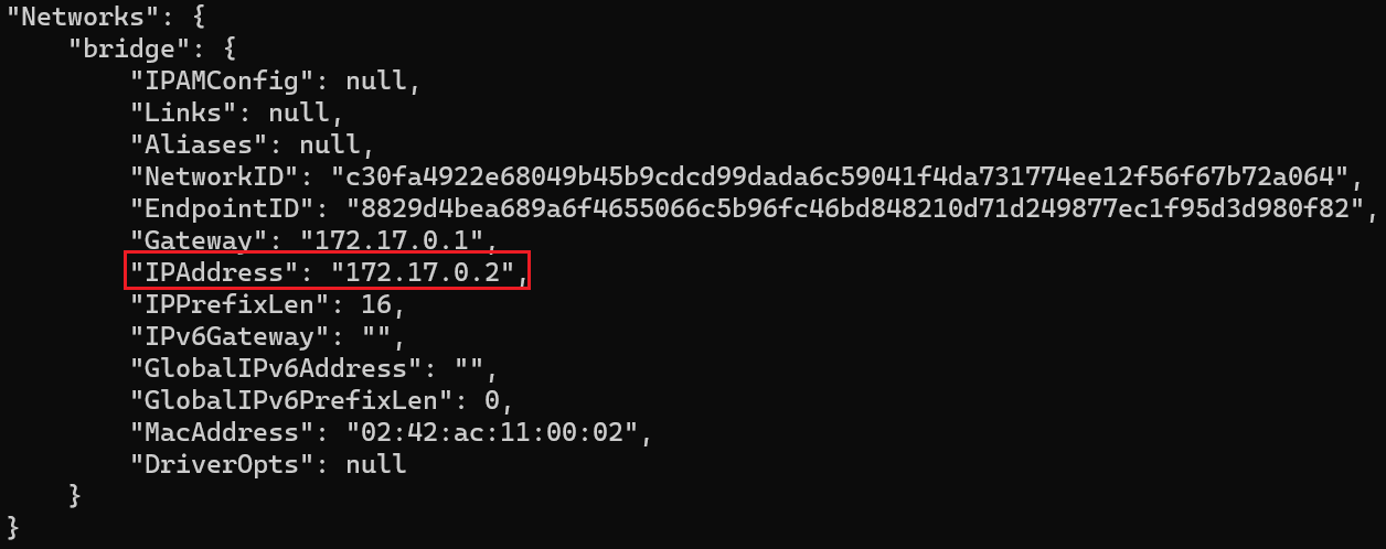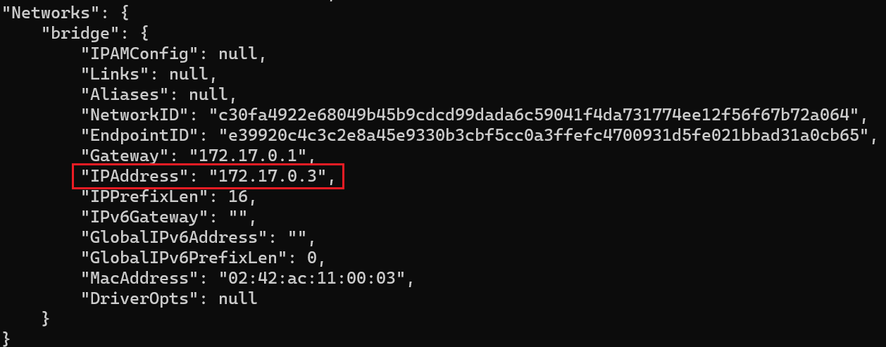 因为虽然宿主机可以通过 127.0.0.1:6379 连接 Redis,因为 Redis 容器通过端口映射的方式把 6379 端口映射到宿主机上;但是对于 RedisInsight 容器来说,是无法通过 127.0.0.1 这个网络连接的,因为 Redis 不是在 RedisInsight 容器内启动,而且端口也不是向它映射,需要拿到 Redis 容器的 IP 地址才能正确连接。通过 docker inspect 容器id 可以看到两个容器的 IP地址: