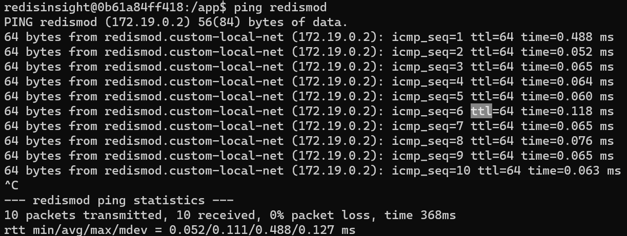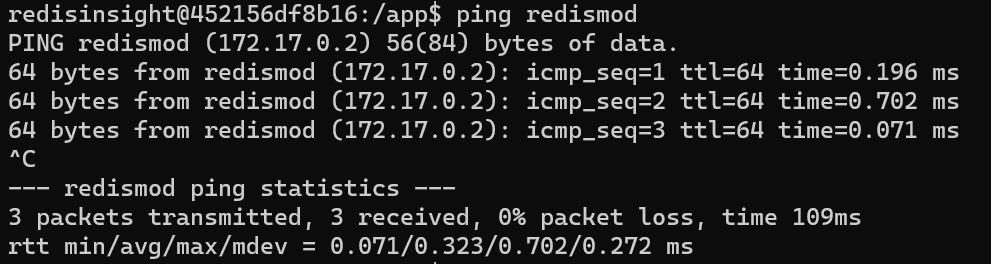 进入 redisinsight 容器中 ping redismod 发现是能 ping 通的,在控制台中自然也能通过 redismod 作为 host 来连接 redis 数据库。