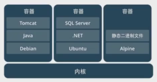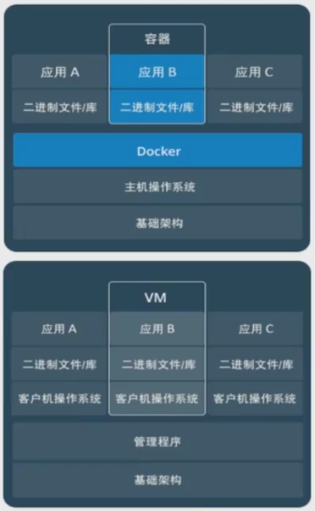 容器虚拟化的是操作系统,和宿主机共享内核;虚拟机虚拟化的是硬件(网卡等),安装时需要把完整的操作系统安装上
