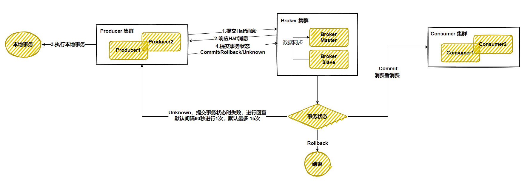 Unknown的消息时,或者由于网络波动、生产者宕机导致长时间没有收到第二阶段提交,会触发事务回查机制